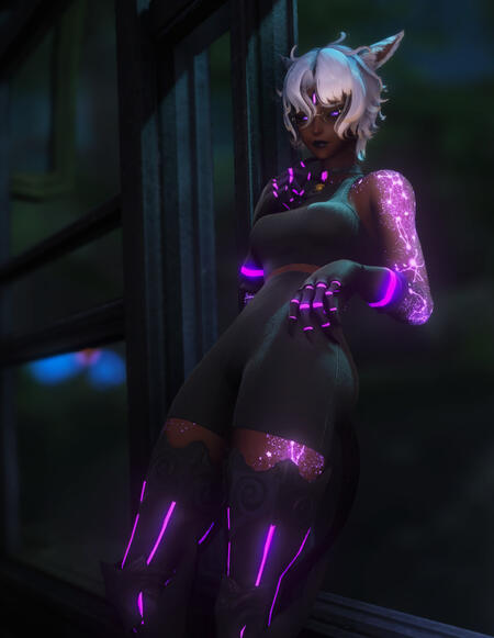 Build: By design, her Xaela body was a fairly athletic form, built for speed and grace, and was given the physique of a nimble dancer. Her new, Miqo'te body sports more defined, faux muscles that which twitch and flex to simulate their organic tissue they were designed to make. While not 'built' by any means, her form gives off the appearance of a fit, firm woman with defined stomach. Slim, yet still sporting subtle curves.